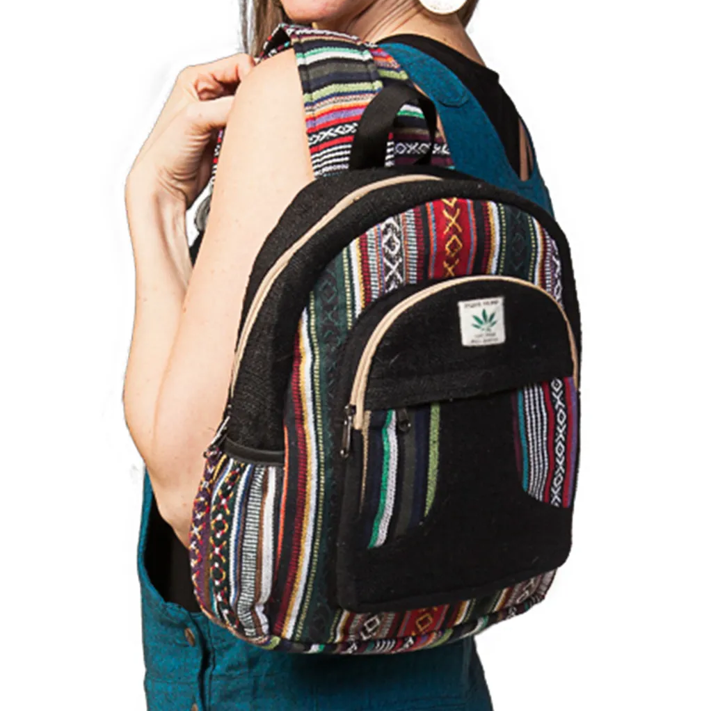 Hemp & cotton knapsack. Has 2 sides pouches, 2 front zippered pocket and 2 inner pockets inside. The straps are adjustable and are slightly padded for shoulder comfort.