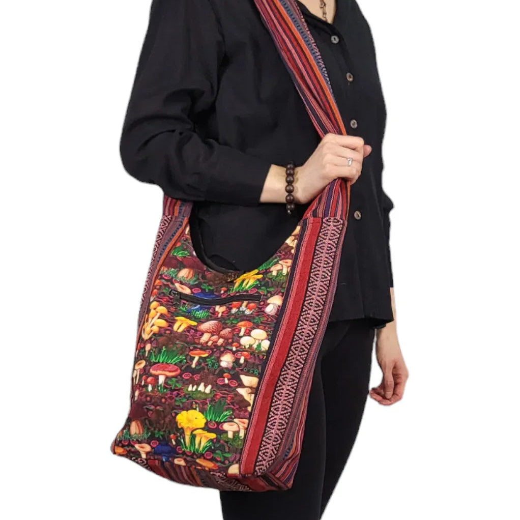 100% Cotton shoulder bag. Has a wide strap and a front & inner pocket and a lot of cute mushrooms printed on the front.