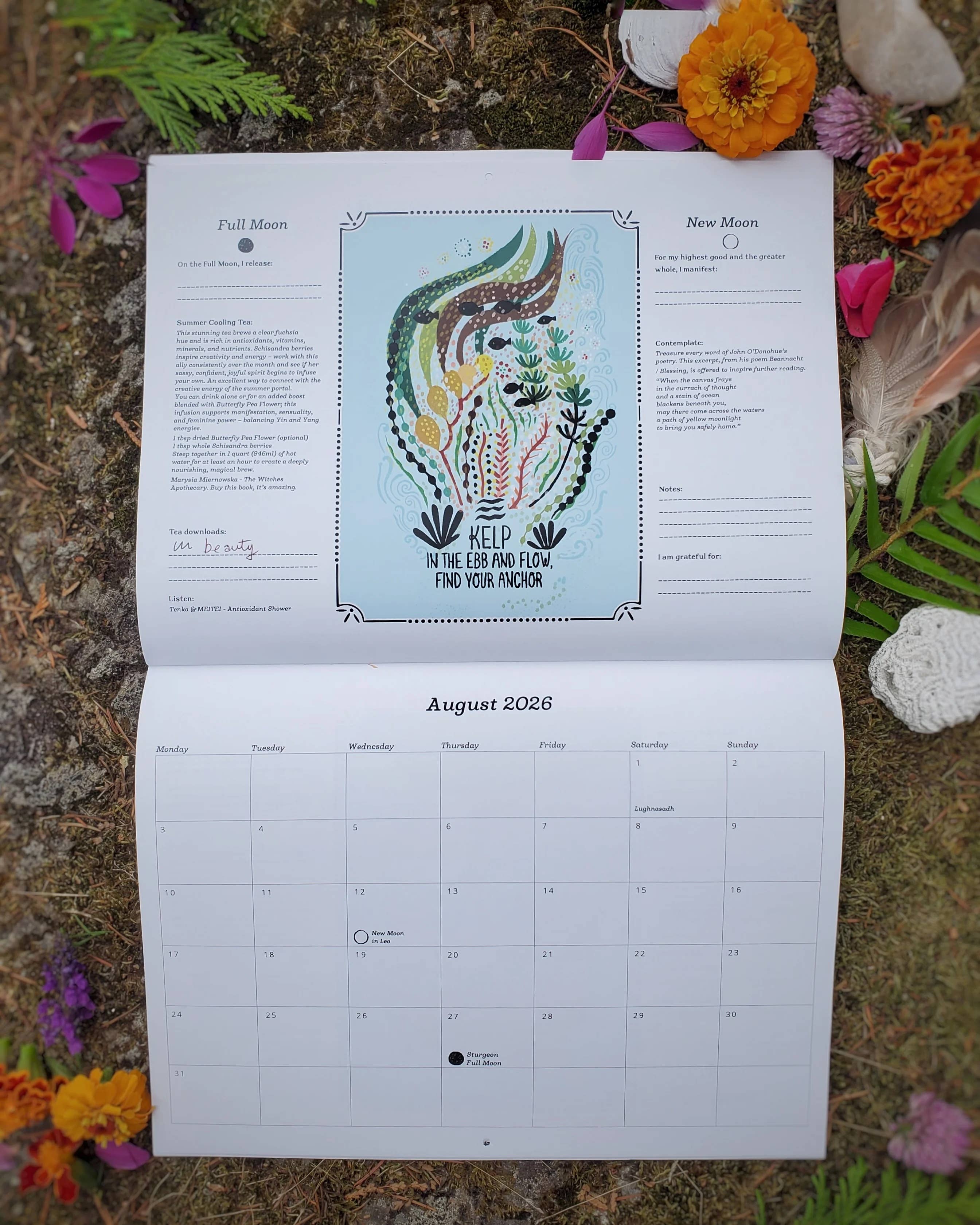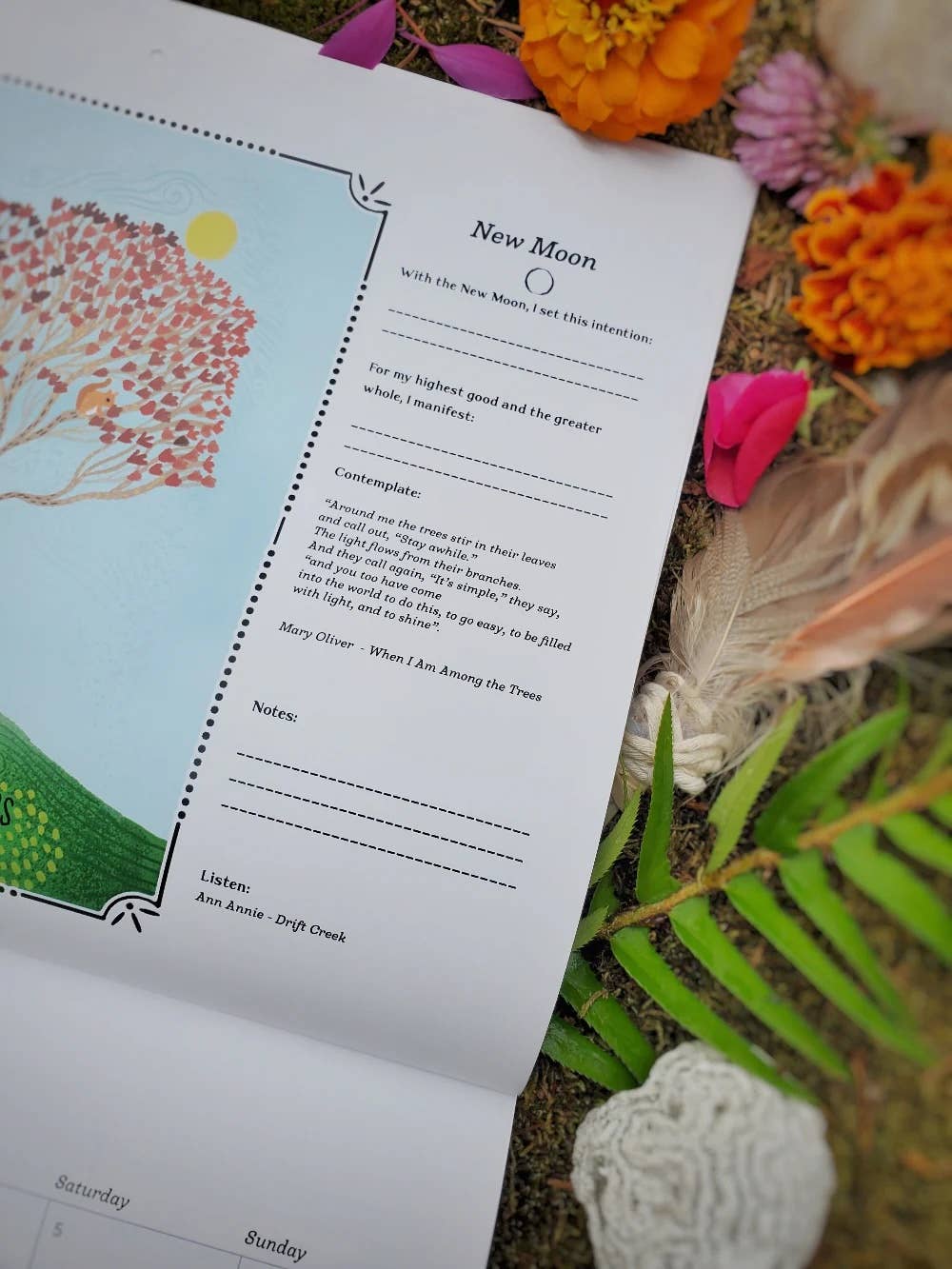 Connect with the natural cycles of the moon and seasons through meditation, breathwork, and movement practices attuned to the energy of each time of year. Designed like a journal, this calendar includes space for setting intentions, releasing, ceremony and ritual practices, song, and contemplations.