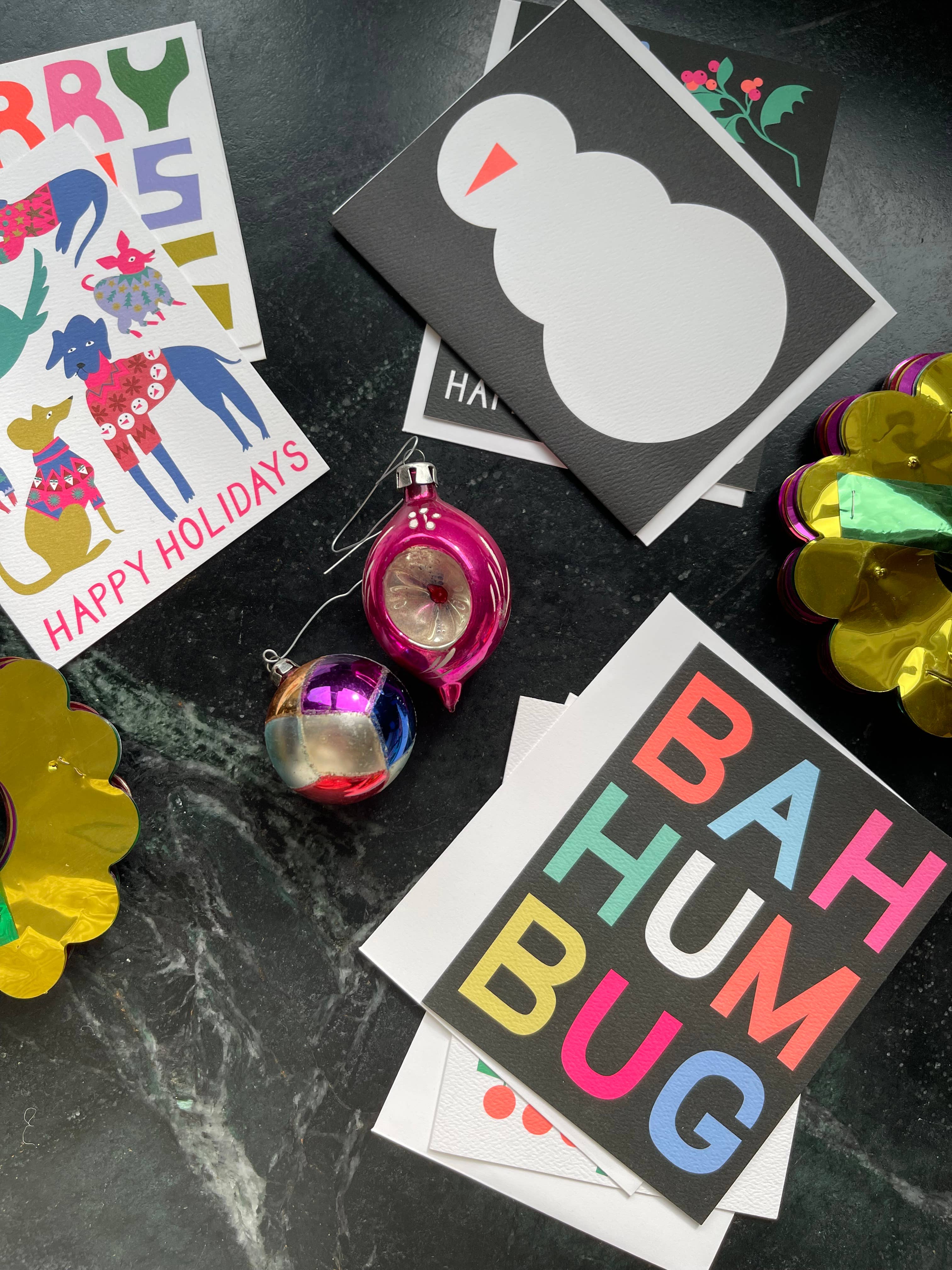 Christmas isn't your favourite? You'd rather leave town and lie in the sun somewhere? We've got a card for you too! The perfect anti-holiday-holiday card, our Bah Humbug note card features beautiful non-seasonal colours (double neon!), a graphic typeface, and our inky custom mix black.