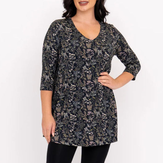 This relaxed-fit tunic features a slight A-line shape, a flattering V-neck, and easy 3/4 sleeves. Made from breathable bamboo fabric, it’s perfect for layering through the fall and winter seasons. Pair it with slim pants or leggings for an effortlessly polished look.