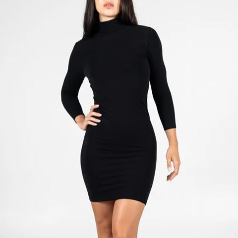 A fitted long sleeve, turtleneck dress that hugs your body showing off your curves in a chic way. This dress is easy to dress up or down and is an essential in any wardrobe.