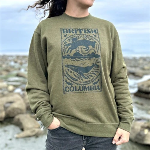 Printed with a deep blue, water-based ink on a heathered olive crew-neck sweatshirt.