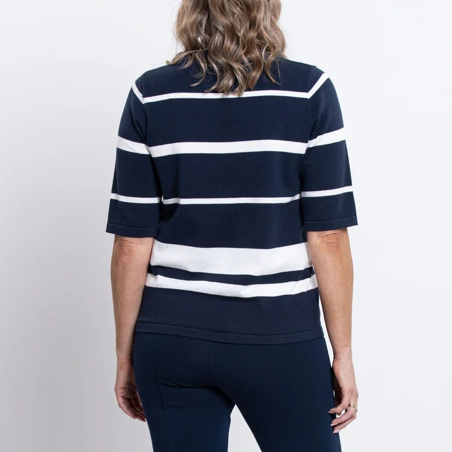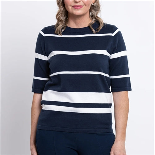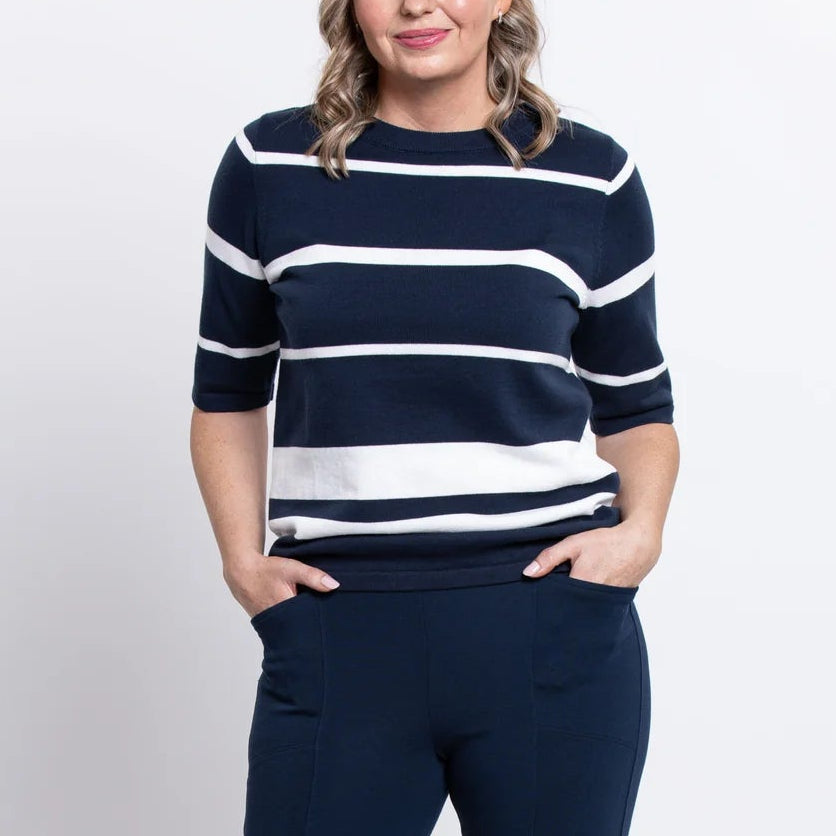 The Serena Sweater is made from 100% cotton and features a crew neckline and 3/4 sleeves. This sweater has a classic cut and nothing says classic like stripes!