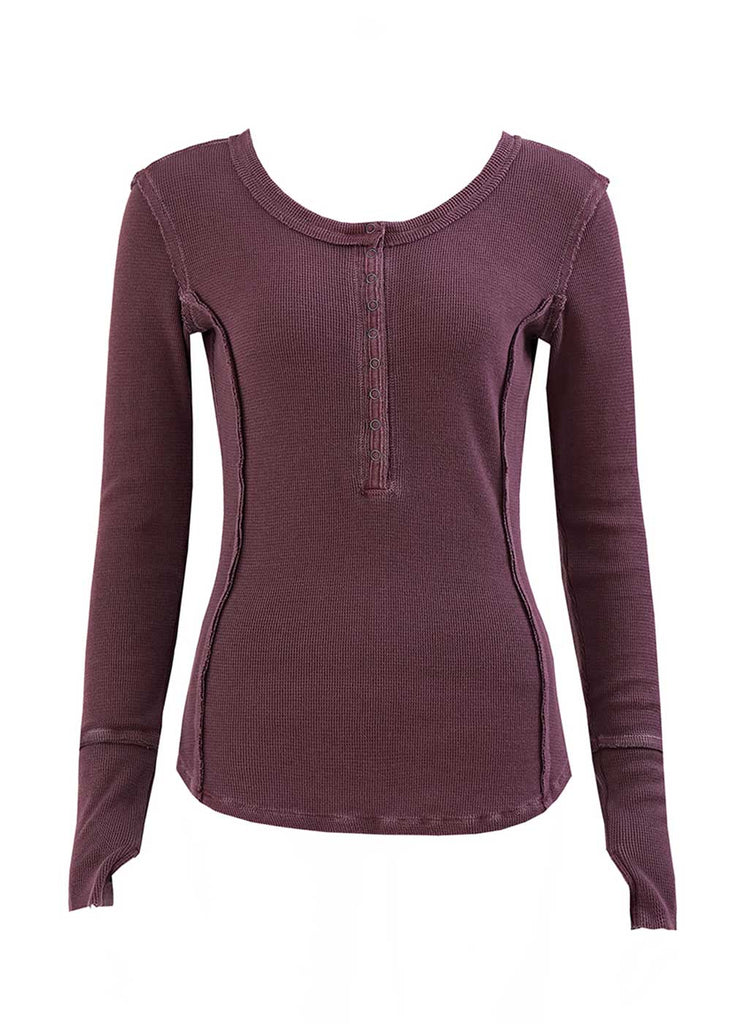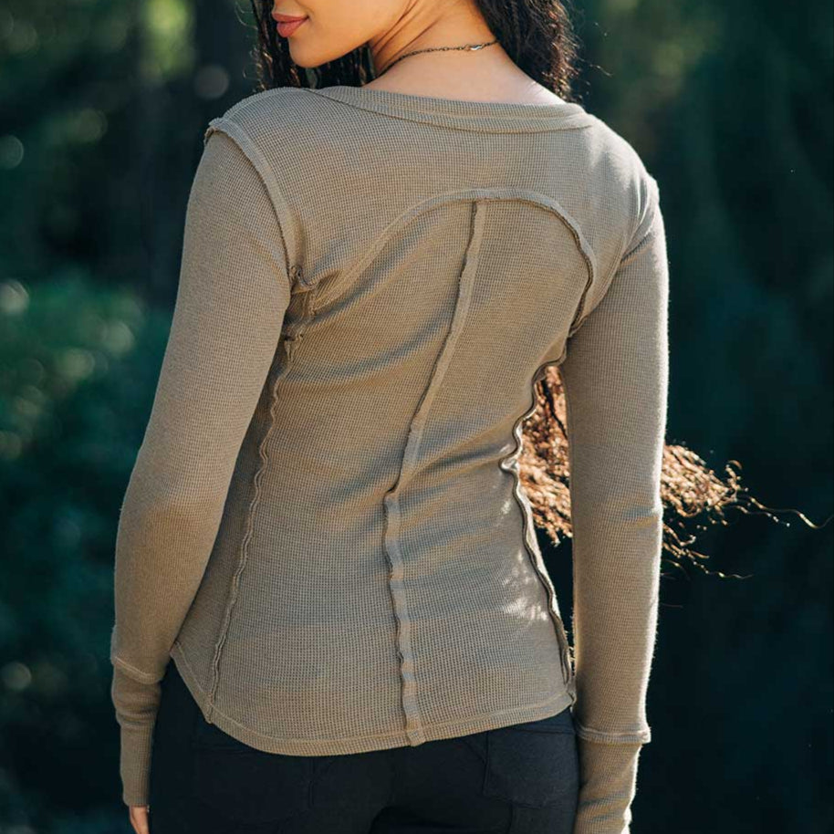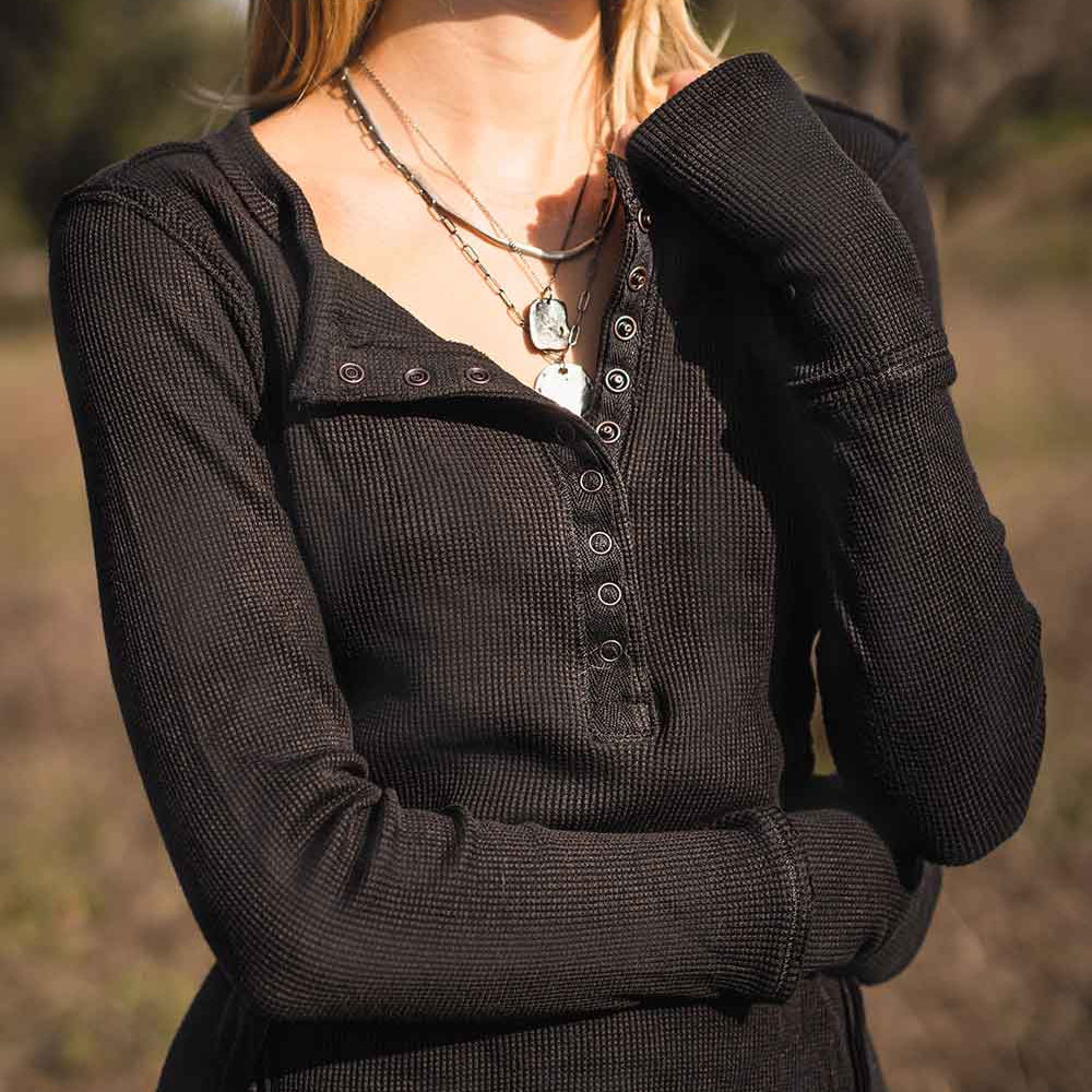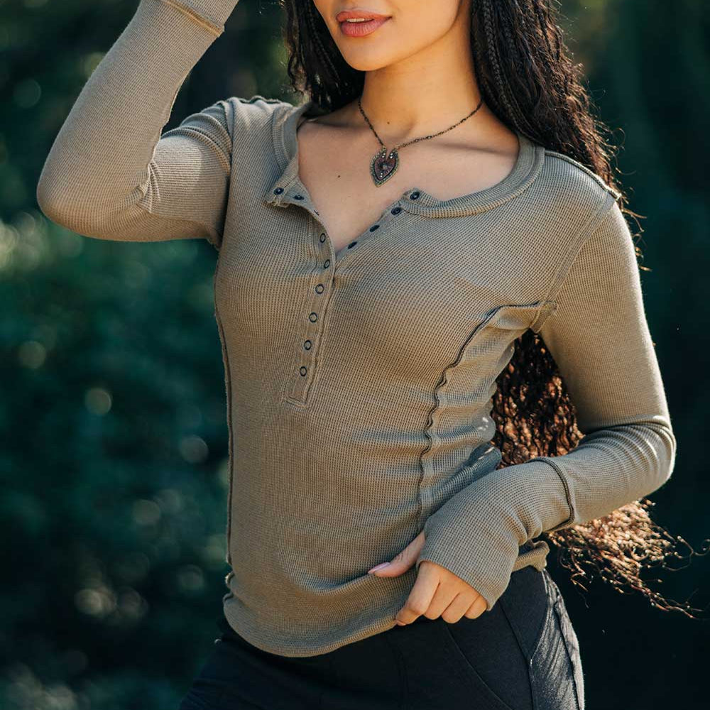 This army-style long sleeve in their brand new organic cotton waffle fabric, is sure to be as legendary as the warrior princess we named it after. Printed in our new GARMENT DYED fabric. Faux-glove sleeves for easy layering under sweaters, distressed flattened seams, sleeper snaps on the collar, and a faux-armor yoke at back. Princess seams at the front and back.
