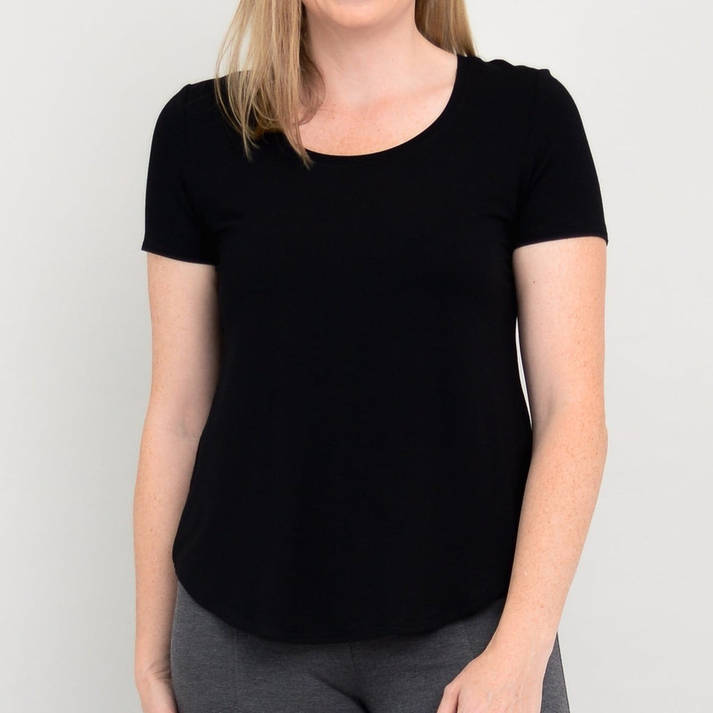 The Tessa offers easy wear with a touch of shaping, for a basic that flatters all. Fabric drapes gently, without pulling or catching around the hips and bottom. A shirt-tail hemline provides fluidity, ensuring a soft visual line. The Tessa Tee compliments trousers, capris and skirts.
